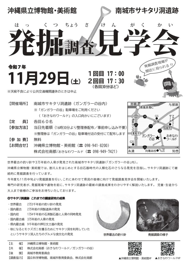 2만 3천년 전의 지층에서 세계에서 가장 오래된 낚시바늘이나 2만 3천년 전의 조개제 비즈 등이 발견된, 간가라 골짜기의 사키타리동 유적미나토가와인을 비롯한 구석기 시대의 인류 화석이 많이 발견되고 있는 오키나와현의 지리적 특성을 근거로, 오키나와 현립 박물관 미술관을 주체로, 한층 더 발견을 목표로 난죠시 사키타리동 유적의 지속적인 발굴 조사가 행해져 왔습니다